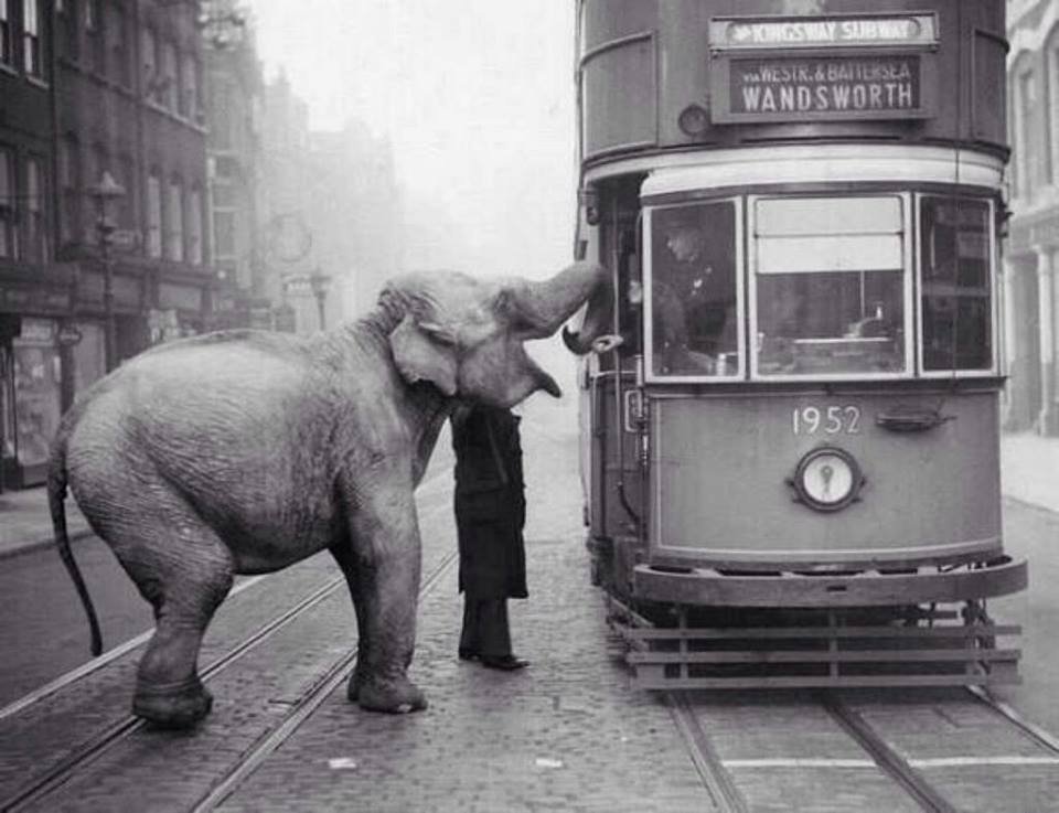 Dicembre 1936: un elefante ferma un tram su Grays Inn Road, a Londra, per ritirare una mela dall’autista.