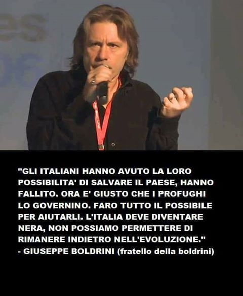 “Gli Italiani hanno avuto la loro possibilità di salvare il paese, hanno fallito. Ora è giusto che i profughi lo governino. Faro (sic!) tutto il possibile per aiutarli. L’Ialia deve diventare nera, non possiamo rimanere indietro nell’evoluzione”