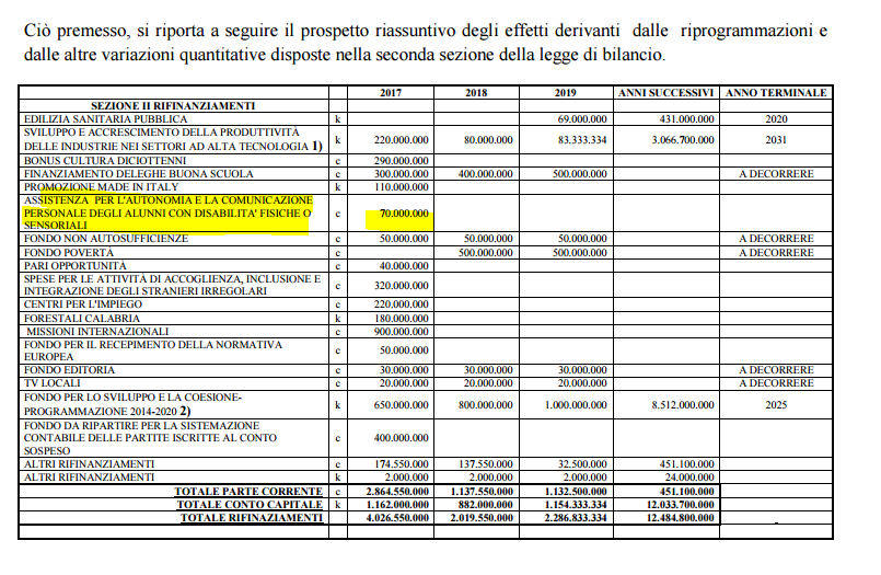 Taglio inesistente, come si evince da una lettura del bilancio di previsione per il 2017, il quale, come evidenziato dal portale indicato, prevede uno stanziamento di 70 milioni di euro per gli scolari e studenti disabili della scuola pubblica