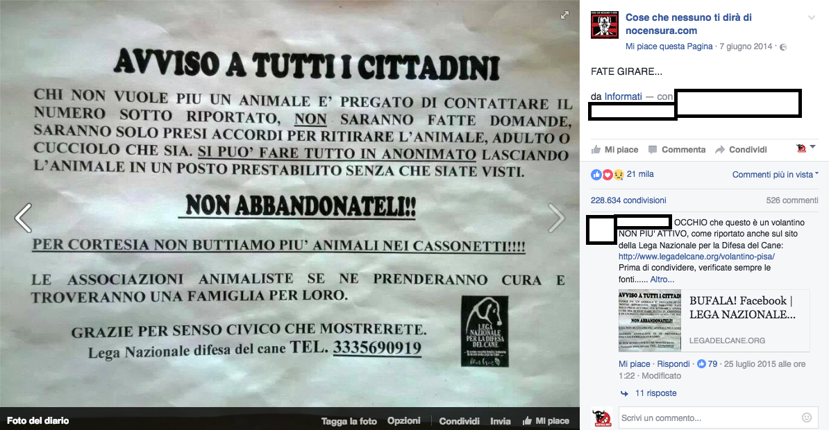 Si premette infatti che le verità di ieri possono diventare le bufale di oggi. Possono intervenire mutamenti nel campo legislativo, o nel mero campo fattuale, come la bufala dei cuccioli in cerca di famiglia… che circola ormai da oltre quindici anni, rendendo impossibile postulare che quei cani siano ancora cuccioli.