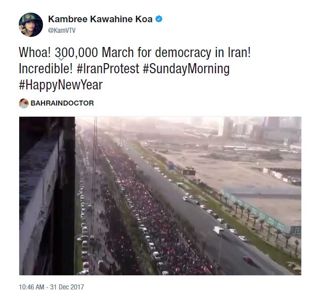 Whoa! 300,000 March for democracy in Iran! Incredible! #IranProtest #SundayMorning #HappyNewYear pic.twitter.com/BQZuXDbh11