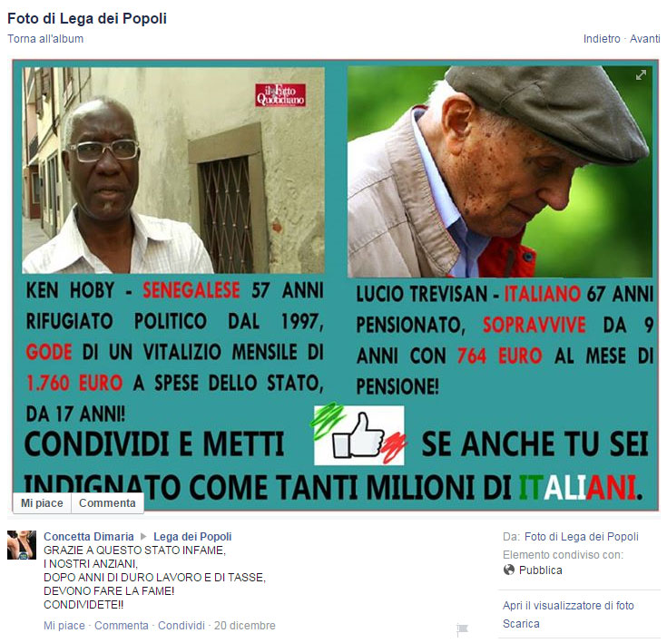 Una pagina Facebook associata alla “Lega dei popoli – Noi con Salvini“, con poco più di 380 “mi piace”, ha condiviso un’immagine (condivisa a sua volta sulla pagina da un utente), alquanto strana e a dir poco ridicola, che denuncerebbe l’ennesima ingiustizia italiana a favore degli immigrati e contro gli italiani (la logica di certe immagini è quella, e ne abbiamo avute parecchie in passato da contestare).