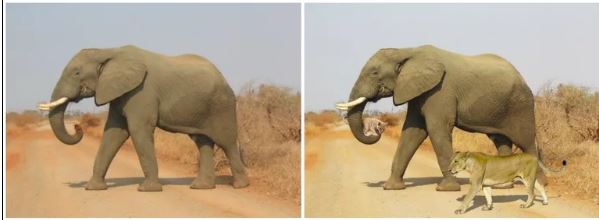 La redazione di Snopes non è stata in grado di individuare le fotografie originarie per i due leoni, ma ha scoperto che l’immagine dell’elefante è stata scattata nel 2005 al Kruger National Park. Ecco un confronto affiancato della fotografia originale dell’elefante (a sinistra) e l’immagine ritagliata che mostra l’elefante che trasporta un cucciolo di leone (a destra):