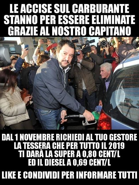 Ieri, 27 ottobre, la pagina Facebook Troll pakati da Salvini (titolo rivelatore finché i contenuti restano nella pagina) ha pubblicato un meme che ritorna sull’argomento delle accise: