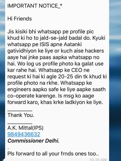 Il messaggio, attribuito al Commissario di Polizia AK Mittal di Delhi consiglia agli utenti di modificare le immagini personali entro i prossimi 20-25 giorni.