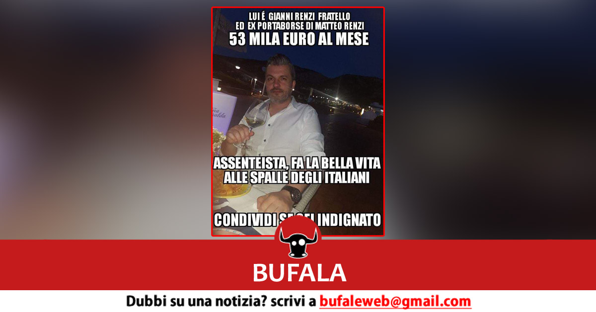 Continua il trend che vede comuni cittadini italiani finire al centro di meme, con relativi messaggi che insinuano parentele con esponenti politici prima fascia, come avvenuto proprio in queste ore attraverso un fantomatico Gianni Renzi. In cosa consiste la bufala odierna? La foto in questione è incentrata su un signore intento a sorreggere un calice di vino in pieno relax, affermando che si tratterebbe del fratello di Matteo Renzi. Ovviamente il post va oltre, evidenziando che per l’incarico di ex portaborse il soggetto in questione guadagnerebbe la bellezza di 53mila euro al mese.