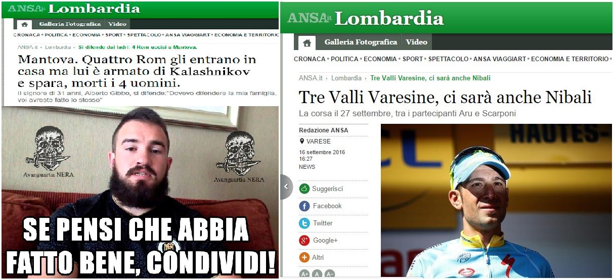 A sinistra: lo screenshot pubblicato da Avanguartia Nera; a destra: uno screenshot catturato a caso su ANSA.it