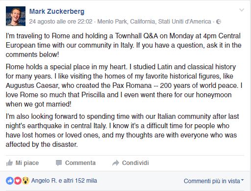 Zuckerberg visiterà Roma Lunedì e chiede agli iscritti di postare nei commenti qualsiasi domanda. Dichiara, inoltre, di sentirsi molto legato alla Capitale per via dei suoi studi classici e di averla visitata in occasione del viaggio di nozze. Il messaggio si chiude con parole di cordoglio verso la popolazione del Centro Italia. Non parla di donazione. Della prossima visita di Zuckerberg a Roma parla anche Il Secolo XIX in questo articolo, ma nemmeno stavolta vi è alcun accenno alla donazione del fondatore di Facebook. La notizia dell’annuncio della visita di Zuckerberg è trattata anche in questo articolo di MoneyCNN ma, allo stesso modo, non v’è traccia della donazione promessa da mr. Facebook.