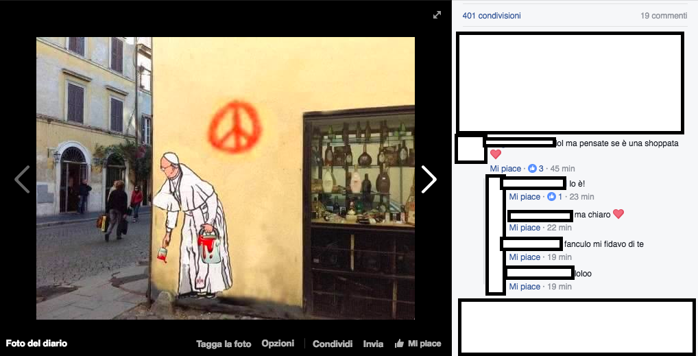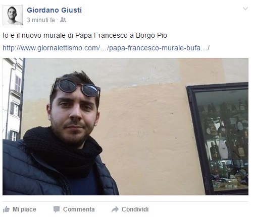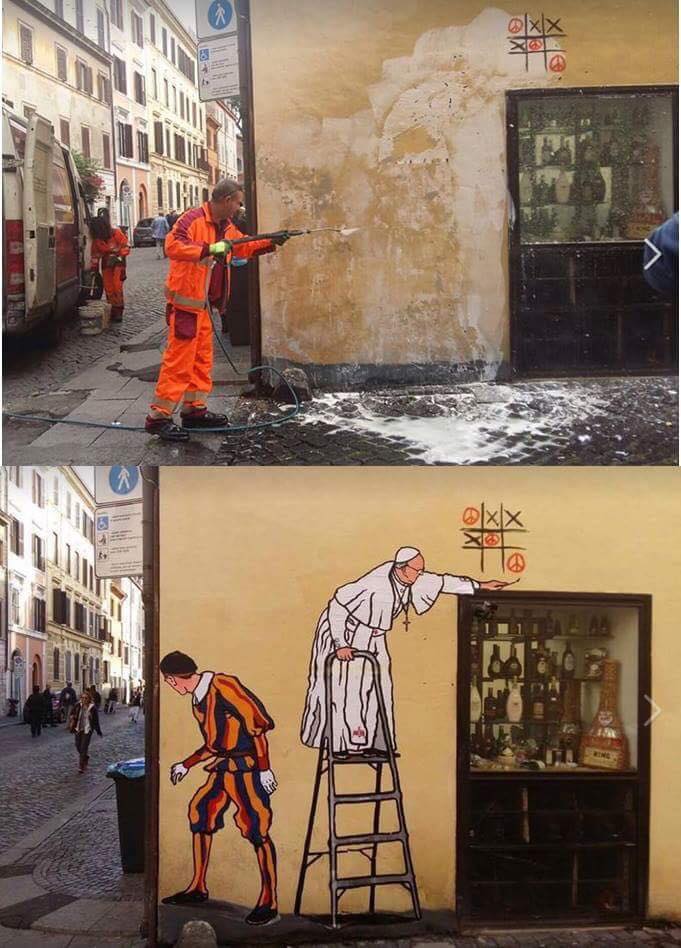 il giorno dopo la rimozione del murales da parte dell’Ama, Amerigo Ciani, il monsignore pittore che nel tempo libero ritrae i barboni di San Pietro per finanziare le missioni in Africa, in una intervista al Messaggero aveva commentato: «Chi ha dato ordine di distruggere quel murales non capisce nulla di arte. Avere cancellato quel bel messaggio di pace significa che a Roma non c’è più posto per l’arte. Che tristezza».