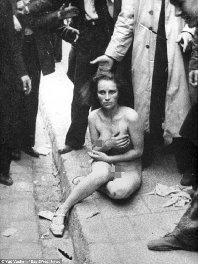 Durante il pogrom di Lwów (qui documentato con un filmato in 8mm), la folla si accaniva sulle donne ebree per umiliarle in mezzo alla strada, strappando loro i vestiti di dosso e colpendole con un sadismo fatto di disprezzo e follia. Notiamo, per esempio, come la stessa donna riportata nella nostra segnalazione compaia in un’altra foto riportata dal Daily Mail: