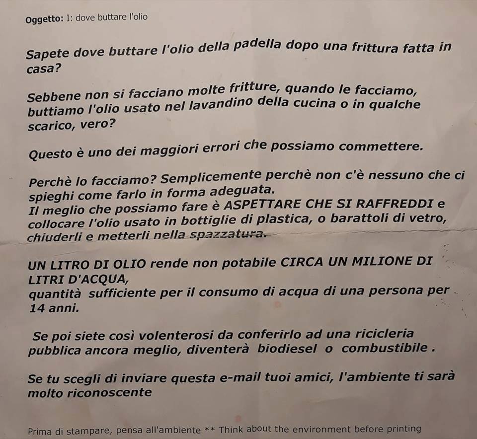 Sebbene lo scartafaccio dica il contrario, buttare barattoli di olio esausto nell’immondizia comune è il modo migliore per innescare le conseguenze nocive indicate nel testo, ed è vietato per legge.
