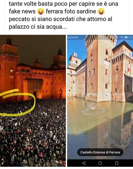 A un paio di giorni dal primo articolo di chiarimento – fatto da noi e non solo – ancora la bufala del fotomontaggio delle sardine al castello di Ferrara continua a girare con nuovi meme e foto tagliate apposta per continuare a dare materiale fasullo in pasto agli stolti che non fanno un altro click prima di condividere. Sin dall’inizio questa bufala non poteva essere considerata una vera e propria notizia; chiunque abbia un minimo di buon senso si accerterebbe che quanto affermato sia vero prima di condividerla o anche solo di diffonderla, considerato quanto è stato facile reperire fotografie che provassero che il fossato e l’acqua ci sono eccome e che no, le sardine non camminano su di essa.