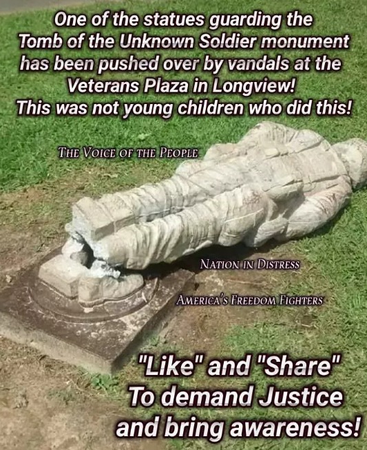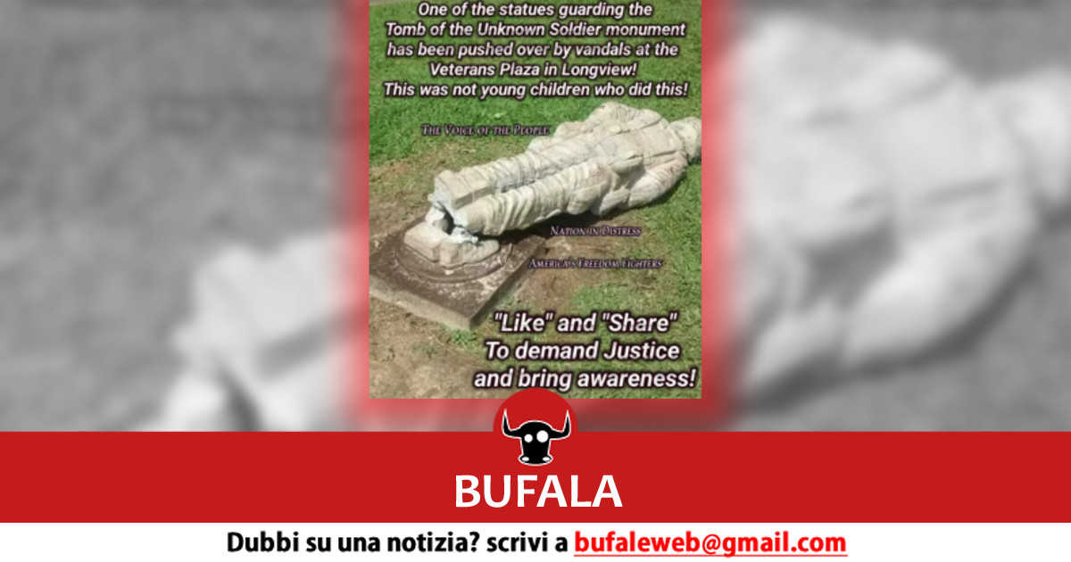 Il post in questione riporta come una delle statue poste vicino al monumento della Tomba del Milite Ignoto sia stata spinta da dei vandali presso la Veterans Plaza di Longview; tra l’altro, verso la fine del meme si aggiunge come non possa essere opera certamente di alcuni bambini un po’ monelli, ma doveva trattarsi per forza di adulti.