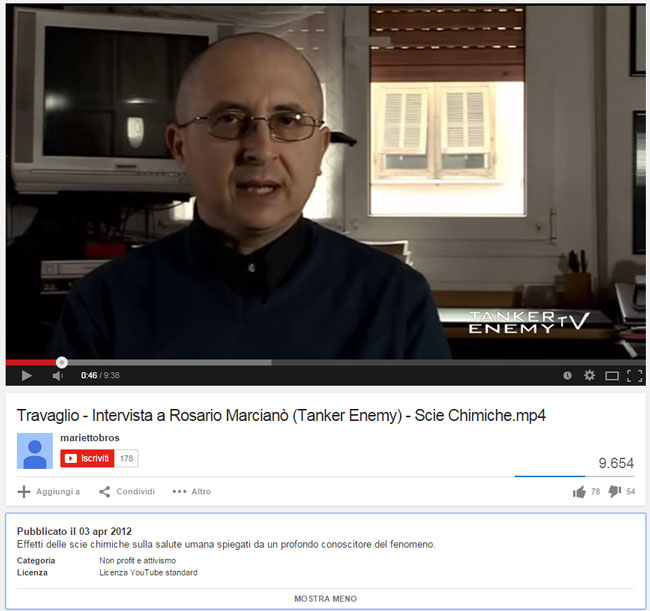 Circola dal 3 aprile 2012 un video dal titolo “Travaglio – Intervista a Rosario Marcianò (Tanker Enemy) – Scie Chimiche”.