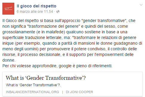 Il Gioco del rispetto si basa sull’approccio “gender transformative“, che non significa “trasformazione del genere” e quindi del sesso, come grossolanamente (e in malafede) qualcuno sostiene in base a una superficiale traduzione letterale, ma: “trasformare le relazioni di genere inique (per esempio, quando a parità di mansioni le donne guadagnano di meno degli uomini) per promuovere il potere condiviso, il controllo delle risorse, il processo decisionale, e il supporto per l’empowerment delle donne.