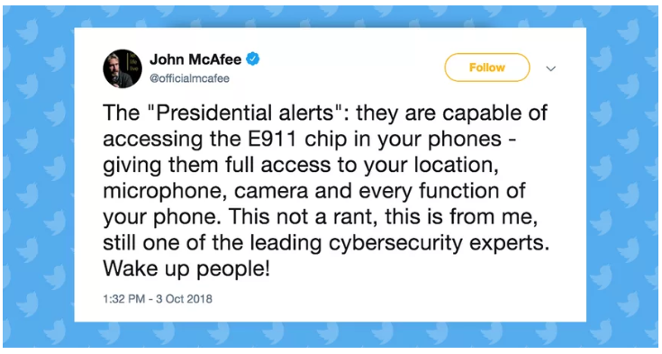 John McAfee, ingegnere del famoso software e sostenitore delle criptovalute, ha affermato che il sistema di allarme presidenziale consente al governo di accedere ai telefoni. In realtà non abbiamo prove a sostegno di tale affermazione.