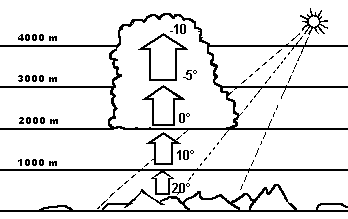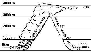Appena superato il crinale l’aria precipita verso il basso, si ha esattamente il fenomeno opposto, l’aria si riscalda per compressione adiabatica, fino a quando contiene goccioline allo stato liquido queste evaporano raffreddando l’aria, il riscaldamento si riduce a 5°C ogni 1000 metri, quando tutte le goccioline saranno evaporate sara’ di 10°C ogni 1000 metri. Ma quasi tutto il vapore contenuto nell’aria e’ stato eliminato sotto forma di pioggia sul lato dello stau, per cui si puo’ ragionevolmente calcolare tutto il versante sottovento (föhn) con un gradiente termico di 10°C ogni 1000 metri.