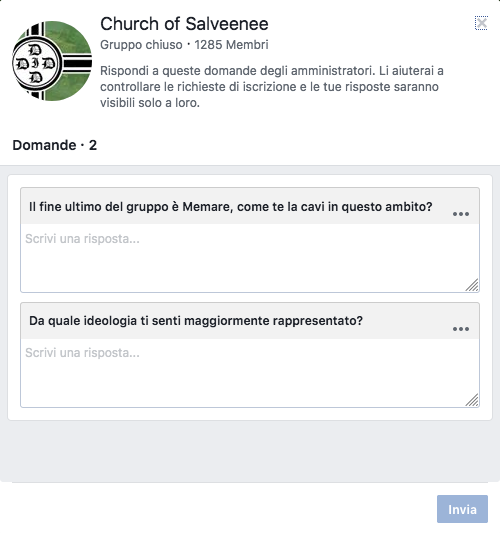 AGGIORNAMENTO: In data 15 Marzo anche la pagina “Dio Imperatore Salvini” risulta definitivamente chiusa. Il gruppo connesso “Church of Salveenee” è inesplicabilmente ancora online, con la sua richiesta di “memes” freschi.