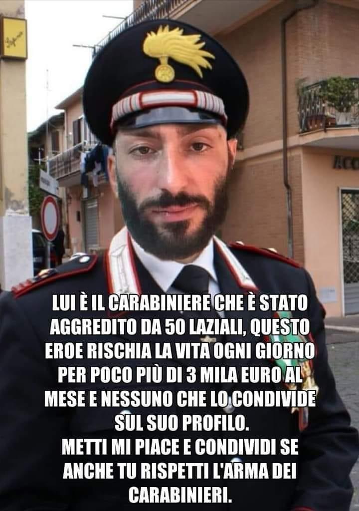 Su questa foto ha scritto: “Lui è il carabiniere che è stato aggredito da 50 laziali. Questo eroe rischia la vita ogni giorno (…) e nessuno lo condivide sul suo profilo”.