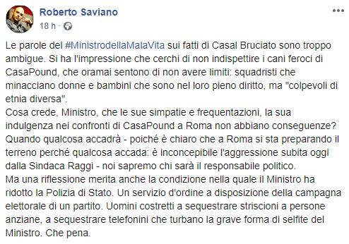 Le parole del #MinistrodellaMalaVita sui fatti di Casal Bruciato sono troppo ambigue. Si ha l’impressione che cerchi di non indispettire i cani feroci di CasaPound, che oramai sentono di non avere limiti: squadristi che minacciano donne e bambini che sono nel loro pieno diritto, ma “colpevoli di etnia diversa”.