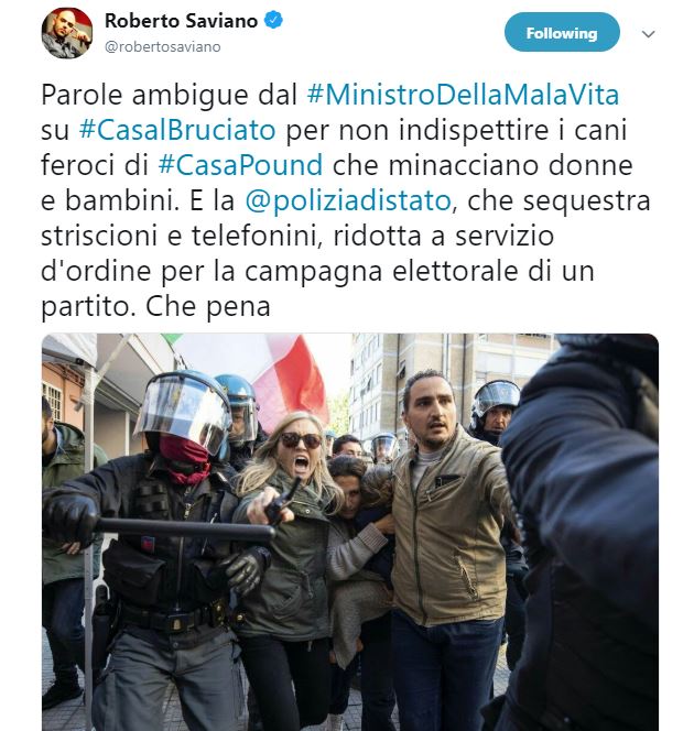 L’8 maggio 2019 lo scrittore e giornalista Roberto Saviano ha twittato un commento sui fatti di Casal Bruciato, con un particolare focus sull’operato della Polizia di Stato:
