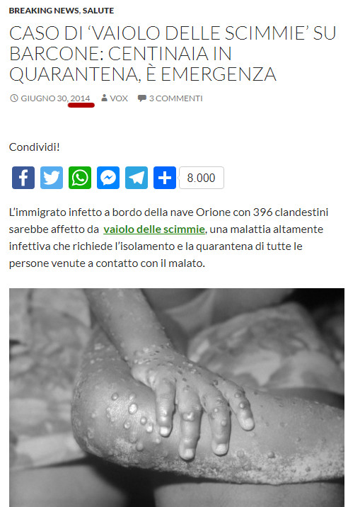 Un articolo pubblicato su Voxnews sta prendendo piede di bacheca in bacheca con tutte le disastrose conseguenze della condivisione compulsiva, considerato che si parla di un caso di vaiolo delle scimmie su un barcone di migranti. Proprio per via del titolo scandalistico e della notizia preoccupante nessuno ha notato che si tratta di un articolo del 2014.