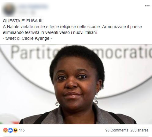 Speravamo di non tornare più sull’argomento, ma anche questa volta ci ritroviamo a smentire la bufala del Natale di Cécile Kyenge. Quest’anno ritorna come la classica immagine con didascalia senza fonti, anche se l’utente in chiusura scrive che si tratta di un tweet, pecca comunque di non riportare una fonte ufficiale.