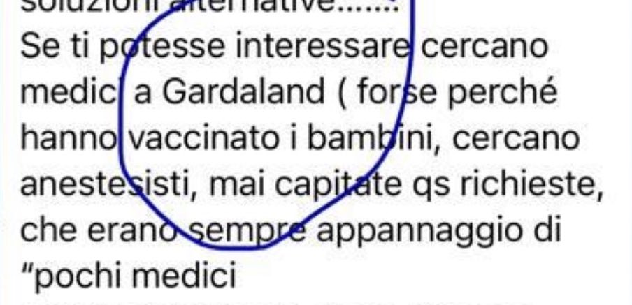 Ci segnalano i nostri contatti una serie di messaggini virali su WhatsApp e affini per cui “cercano medici a Gardaland”. Il riferimento è, ovviamente, alla nota fake news per cui i vaccini causerebbero malori e morie dei “sierati”.