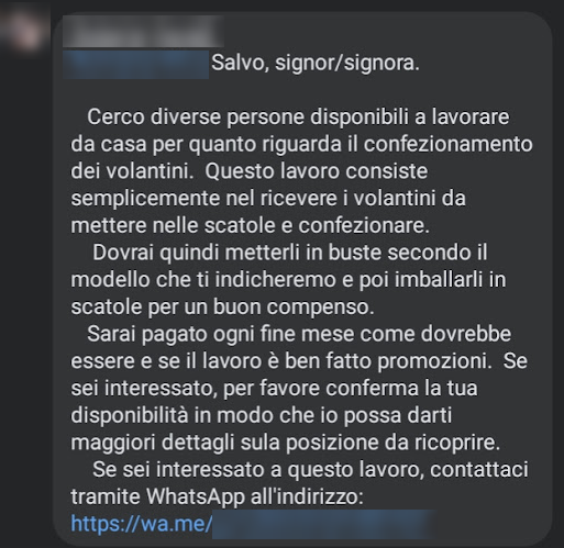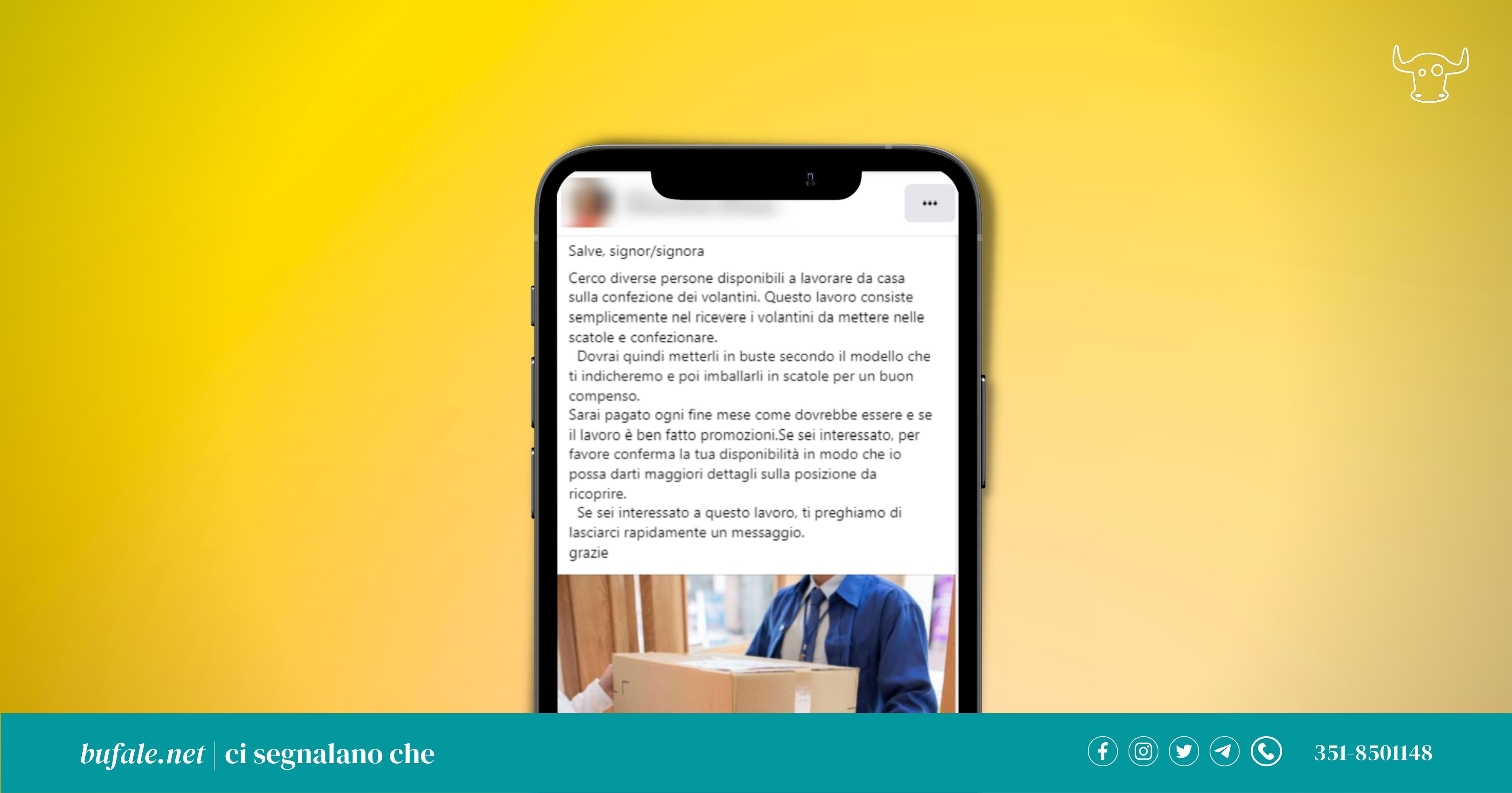 Cerco diverse persone disponibili a lavorare da casa per quanto riguarda il confezionamento di volantini. Questo lavoro consiste semplicemente nel ricevere i volantini da mettere nelle scatole e confezionare. Dovrai quindi metterli in buste secondo il modello che ti indicheremo e poi imballarli in scatole per un buon compenso. Sarai pagato ogni fine mese come dovrebbe essere e se il lavoro è ben fatto promozioni. Se sei interessato, per favore conferma la tua disponibilità in modo che io possa darti maggiori dettagli sulla posizione da ricoprire. Se sei interessato a questo lavoro, contattaci tramite WhatsApp all’indirizzo https://wa.me**********