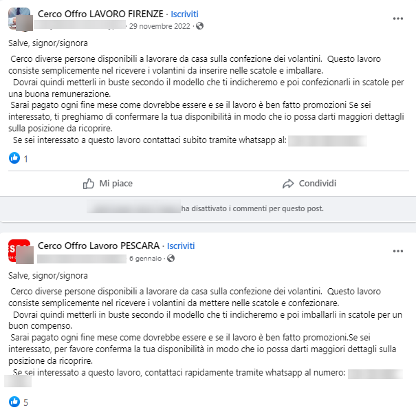 “Cerco diverse persone disponibili a lavorare da casa”. I nostri lettori ci segnalano una serie di commenti che compaiono sotto alcuni post pubblicati su Facebook.
