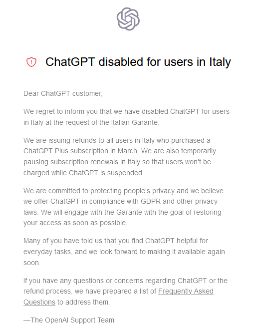 ChatGPT inaccessibile in Italia a seguito del provvedimento del Garante