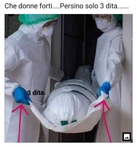 “Che donne forti, persino solo 3 dita”, recita la didascalia di un’immagine che mostra due operatori sanitari mentre trasportano un corpo fuori da un’abitazione. Secondo l’autore del contenuto le due persone stanno trasportando un corpo finto, considerando la posizione delle dita che stringono il lenzuolo.