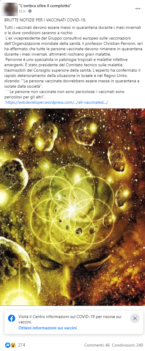 Di Christian Perronne non abbiamo mai parlato, ma i nostri lettori ci segnalano un post in cui si fa riferimento a una sua recente affermazione sulle persone vaccinate. Medico, docente universitario specializzato in patologie tropicali e malattie infettive, recentemente ha rilasciato dichiarazioni sulla “pericolosità delle persone vaccinate” che andrebbero messe in isolamento in quanto rappresenterebbero un pericolo per i non vaccinati contro il Covid-19. Il post che prendiamo in analisi è stato pubblicato sulla pagina Facebook L’ombra oltre il complotto ieri, mercoledì 15 settembre.