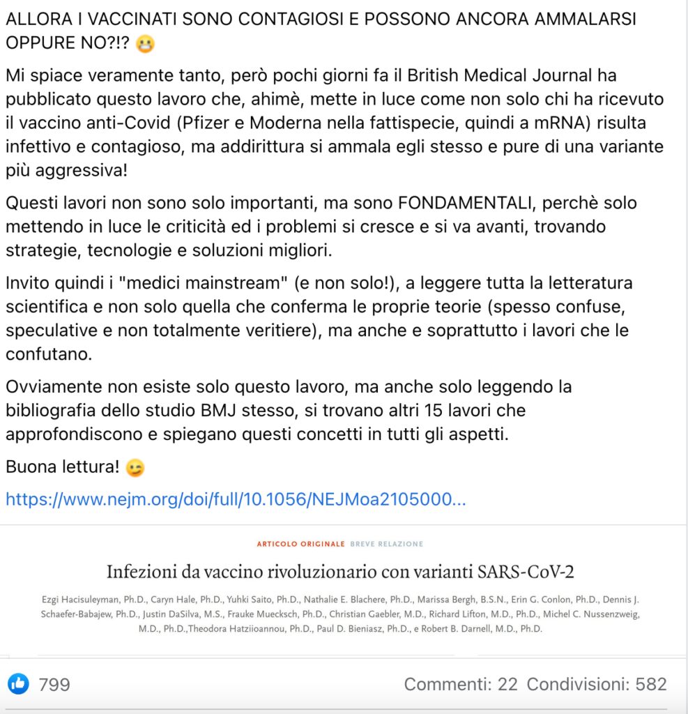 Ci segnalano i nostri contatti una condivisione per cui “chi ha ricevuto il vaccino si ammala di una variante più aggressiva”, con espresso riferimento ai vaccini a mRNA.