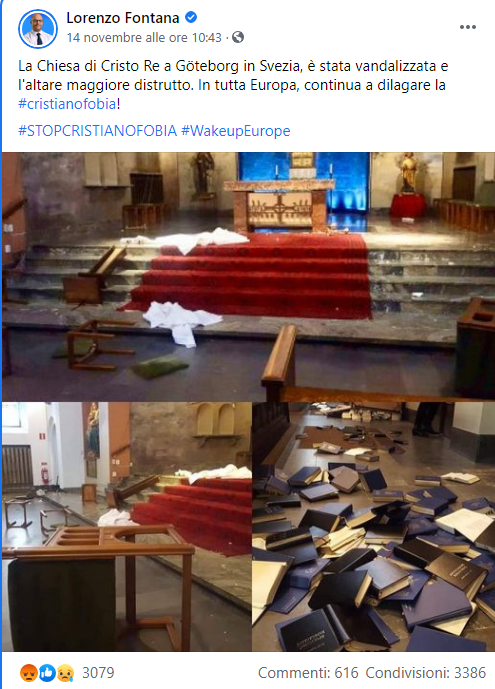 Le immagini che arrivano dalla chiesa vandalizzata in Svezia sono molto forti. È accaduto a Heden, al centro di Göteborg, venerdì 13 novembre presso la parrocchia di Cristo Re. I nostri lettori ci segnalano un post pubblicato da Lorenzo Fontana il 14 novembre 2020. Il vicesegretario della Lega parla di cristianofobia e tra i commenti dilagano i riferimenti all’Islam. Ricostruiamo insieme la triste vicenda.