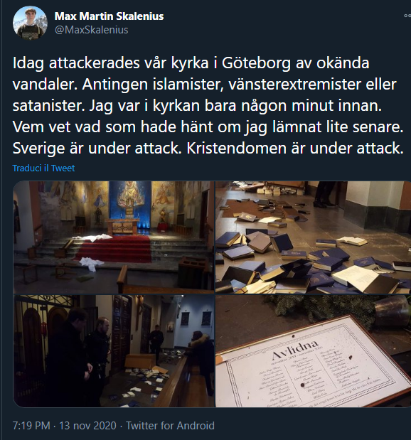 Sputnik News riporta le dichiarazioni rilasciate dal giovane attivista Max Skalenius su Twitter. Skalenius racconta che si trovava nella chiesa del Cristo Re pochi minuti prima dell’agguato e aveva notato la presenza di estranei. Anche il giovane attivista sfoga la sua rabbia con parole che fanno riferimento all’Islam e al satanismo: