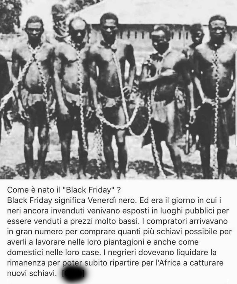 Black Friday significa Venerdì nero. Ed era il giorno in cui i neri ancora invenduti venivano esposti in luoghi pubblici per essere venduti a prezzi molto bassi. I compratori arrivavano in gran numero per comprare quanti più schiavi possibile per averli a lavorare nelle loro piantagioni e anche come domestici nelle loro case. I negrieri dovevano liquidare la rimanenza per poter subito riparitire per l’Africa a catturare nuovi schiavi.