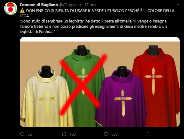 Comune di Bugliano: “Don Enrico si rifiuta di usare il verde liturgico perché è il colore della Lega”