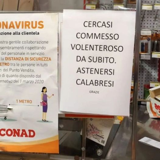 Una storia ormai passata nel dimenticatoio come tante altre, quella del finto annuncio di lavoro comparso all’interno di un punto vendita Conad. Certamente un volantino bizzarro, con tanto di discriminazione verso il popolo calabrese nonché un contenuto perfetto per un post al vetriolo, altrettanto perfetto per il caos social e l’indignazione di massa.