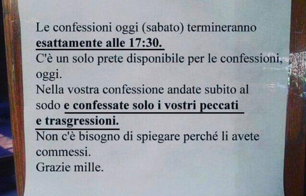 Ci segnalano i nostri contatti una divertente immagine titolata Confessate solo i vostri peccati e trasgressioni.