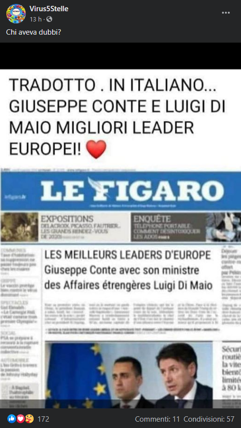 Il mondo dell’Internet è pieno di generatori di fake, anche per quanto riguarda le prime pagine dei giornali. I nostri lettori ci segnalano l’immagine della prima pagina di Le Figaro sulla quale leggiamo il titolone: “Conte e Di Maio migliori leader d’Europa”, con tanto di foto del premier e del ministro. L’immagine è comparsa sulla pagina Facebook Virus5Stelle il 30 luglio 2020 alle 22:10.
