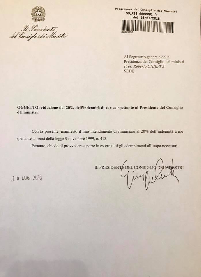 Proprio all’insegna della trasparenza vi mostro qui la lettera, datata 16 luglio, che riporta la richiesta al Segretario Generale di Palazzo Chigi – Presidenza del Consiglio dei Ministri per la riduzione del 20% dell’indennità di carica spettante al Presidente del Consiglio dei Ministri a cui, appunto, ho fatto riferimento ieri pomeriggio.