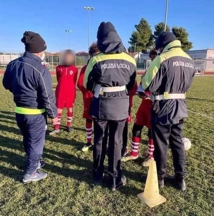 Controlli green pass in campo? Un’immagine sta circolando di bacheca in bacheca, con una descrizione più o meno corretta ma soprattutto riproposta con un taglio polemico. La foto mostra tre agenti della polizia locale di fronte a tre giovanissimi calciatori. Secondo la descrizione, lo scatto immortalerebbe i tre funzionari nell’atto di controllare il green pass ai giocatori. Approfondiamo insieme.