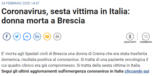 Nel pomeriggio di oggi, 24 febbraio 2020, TgCom24 ha pubblicato la notizia di una donna morta a Brescia per il Coronavirus. Secondo il portale d’informazione Mediaset la donna sarebbe deceduta agli Spedali Civili dopo esservi stata trasportata domenica 23 febbraio 2020 da Crema. Si tratterebbe di una paziente oncologica con il quadro clinico già compromesso.