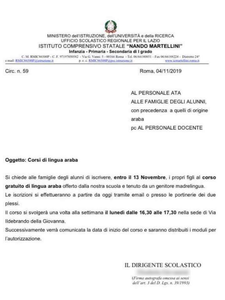 Sulla pagina Facebook del deputato di Fratelli D’Italia Galeazzo Bignami è stata pubblicata l’immagine di una circolare dell’Istituto Comprensivo “Nando Martinelli” di Roma. La circolare è rivolta al personale ATA e alle famiglie degli alunni “con precedenza a quelle di origine araba”. La comunicazione chiede alle famiglie di iscrivere entro il 13 novembre i propri figli al corso di lingua araba offerto dalla scuola e tenuto da un genitore madrelingua. La circolare è firmata dal dirigente scolastico.