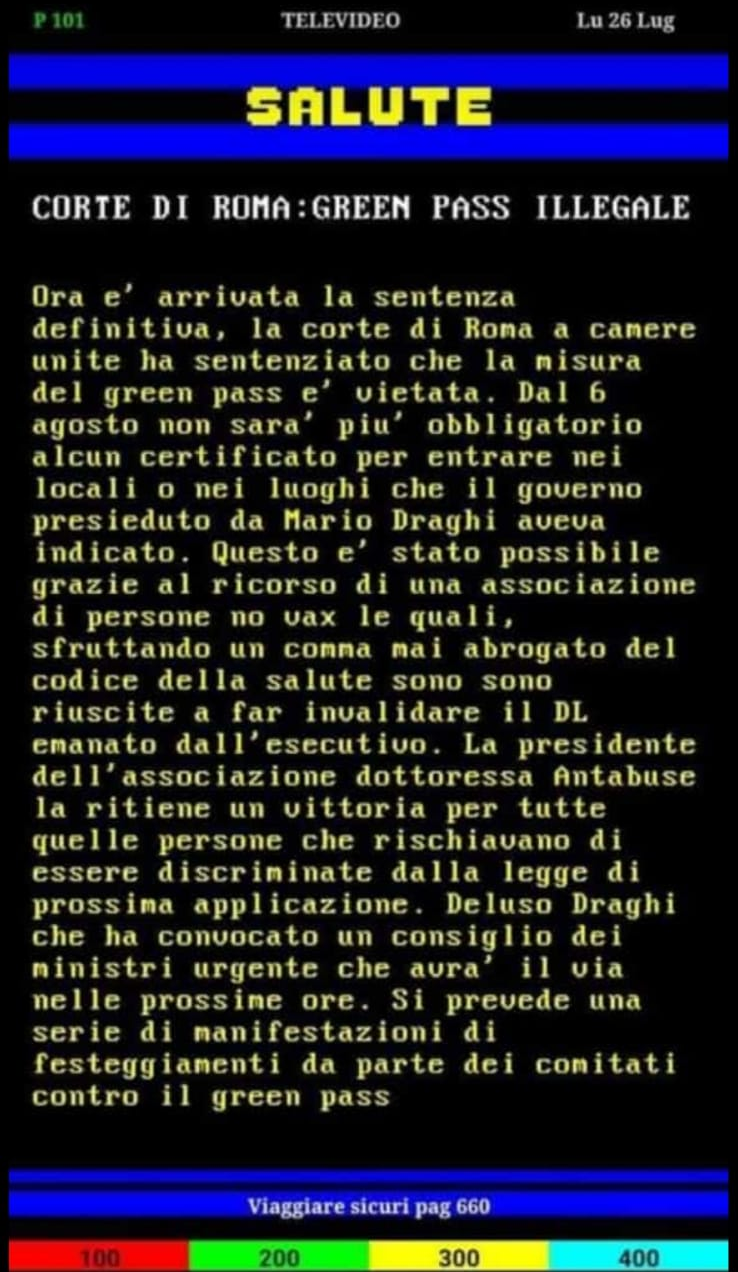 “Corte di Roma: Green Pass illegale“, per molti no-pass sarebbe un “tana libera tutti”, ma non è nient’altro che l’ennesima pagina fake del Televideo di cui ci siamo occupati più volte (visita il nostro archivio). Secondo questo nuovo messaggio in circolazione sui social, un’associazione di no vax guidata dalla dottoressa Antabuse (!) sarebbe riuscita a ” far invalidare il DL emanato dall’esecutivo”. Leggiamo il messaggio integrale.