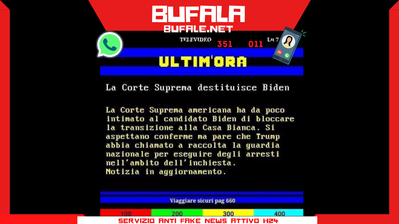 A conti fatti, è del tutto inventata la storia intitolata “Corte Suprema destituisce Biden”. Non ci sono fonti in Italia e soprattutto negli Stati Uniti in grado di avvalorare questa tesi, senza contare il fatto che tramite alcune app inventate appositamente, è molto semplice usare la grafica classica del televideo per inventare notizie del genere. Dunque, nulla da fare per Biden nella sua lunga lotta per il riconteggio delle schede. Ad oggi, infatti, il successo politico del suo antagonista non è minimamente in discussione.