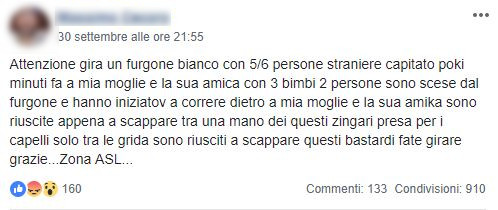Attenzione gira un furgone bianco con 5/6 persone straniere capitato poki minuti fa a mia moglie e la sua amica con 3 bimbi 2 persone sono scese dal furgone e hanno iniziatov a correre dietro a mia moglie e la sua amika sono riuscite appena a scappare tra una mano dei questi zingari presa per i capelli solo tra le grida sono riusciti a scappare questi bastardi fate girare grazie…Zona ASL..