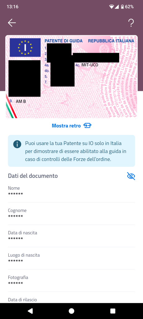 Unica nota poco comprensibile è come la possibilità di oscurare i dati della patente (sostituendoli con asterischi) non si estenda alla riproduzione fotografica della stessa (oscurata dallo scrivente), rendendo così tale oscuramento un po’ un esercizio di stile.