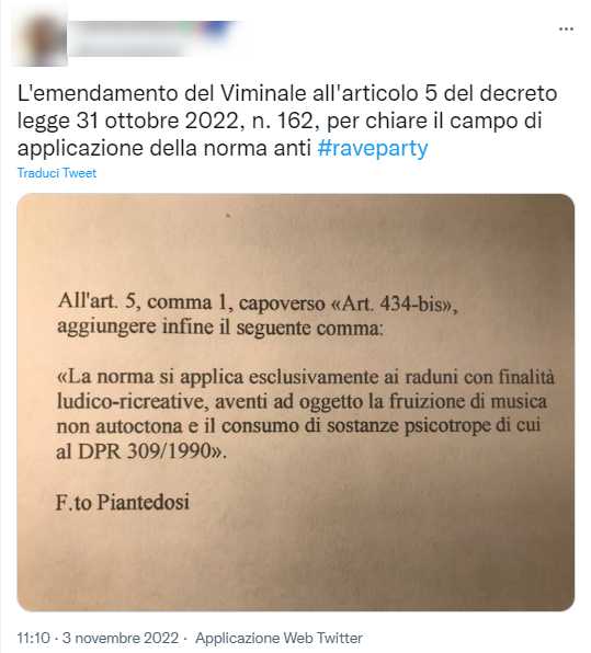 Secondo un post comparso su Twitter, tuttavia, il ministro Piantedosi avrebbe firmato un emendamento che limiterebbe i provvedimenti contenuti all’interno del decreto anti-rave ai soli raduni in cui si fruisce musica non autoctona.